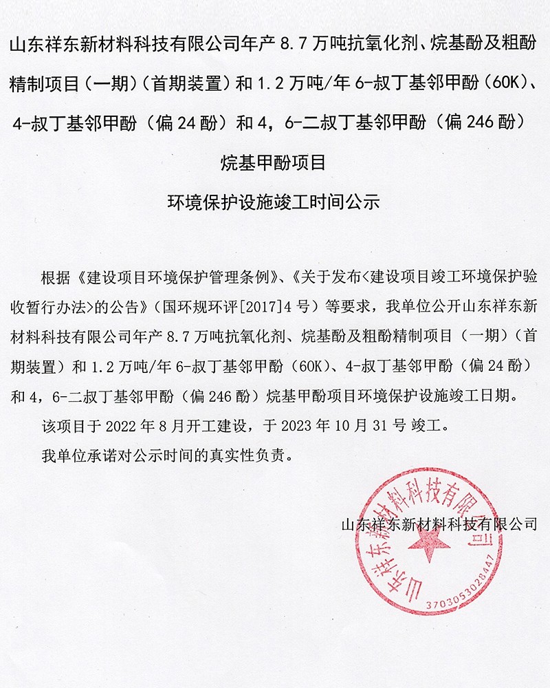 山東祥東新材料科技有限公司1.2萬噸/年6-叔丁基鄰甲(60K)、4-叔丁基鄰甲酚(偏 24 酚)和 4,6-二叔丁基鄰甲酚(偏 246 酚)烷基甲酚項目竣工環境保護驗收監測報告